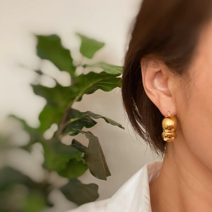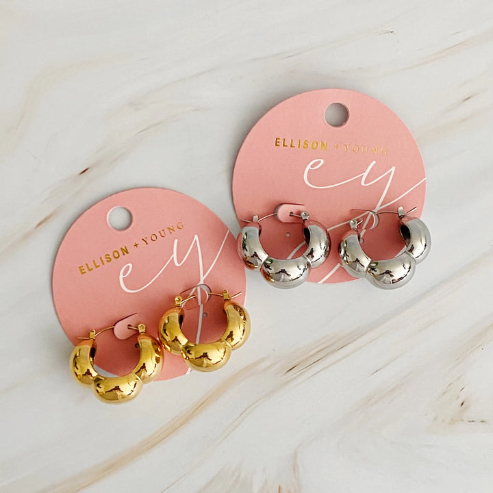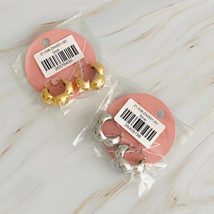 Introducing our Beautifully Volumized Hoop Earrings. These sophisticated earrings feature a unique round-shaped design, adding a touch of elegance and style to any outfit.