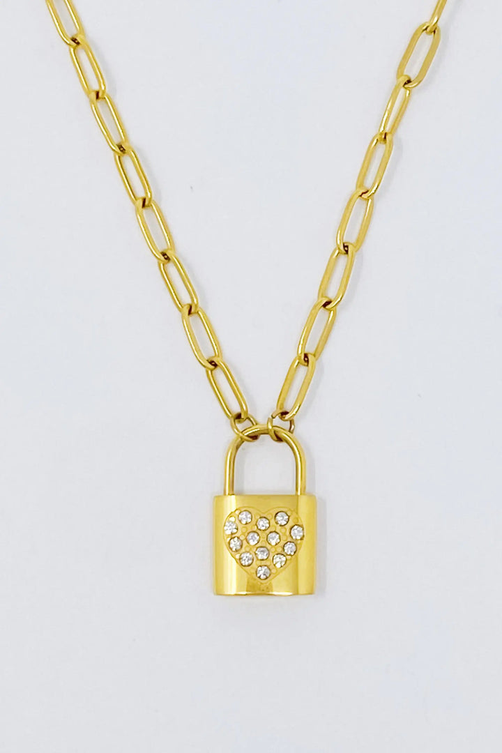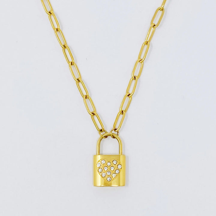 Trendy link chain and lock pendant with shiny heart in the center. 18 inch chain with 2 inch extender Stainless steel, 18 K gold plated. Great quality that last long with...