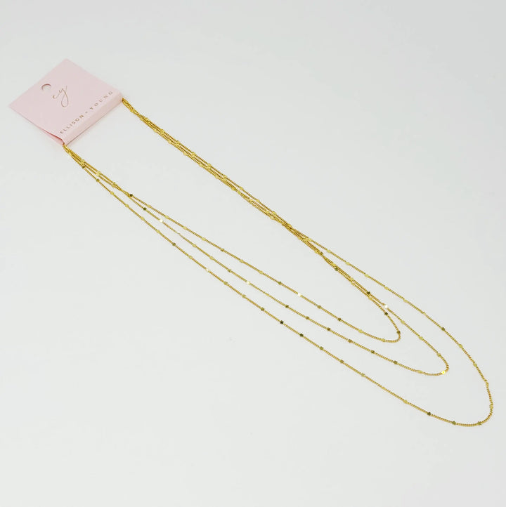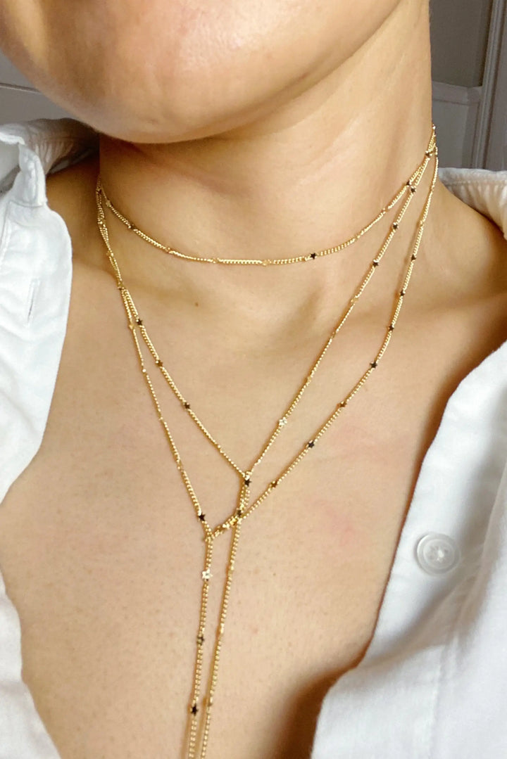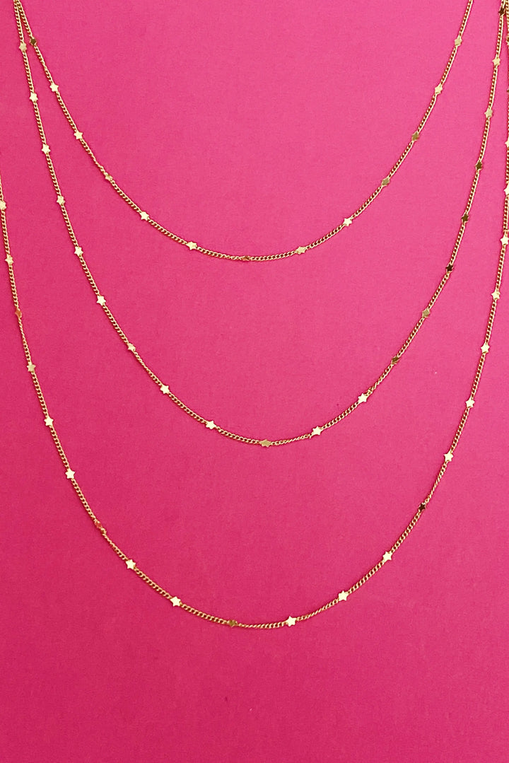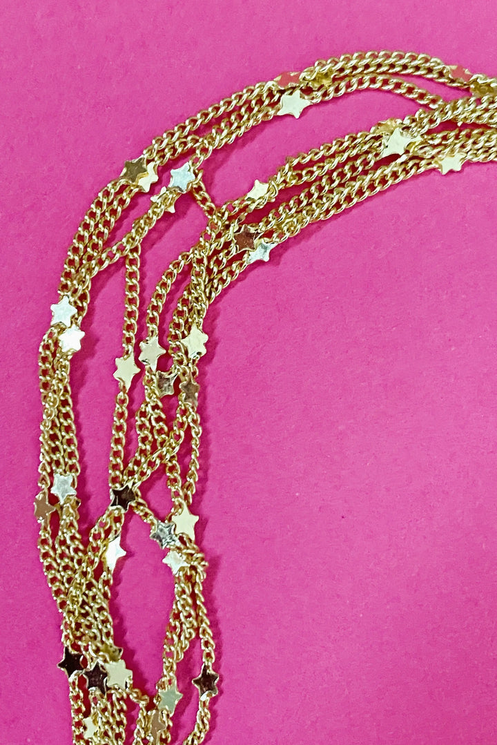 Little tiny stars in between. It can be wrapped around necklace or bracelet. 70 inch long linked chain. 18k gold plated brass Lead compliant. Made in China