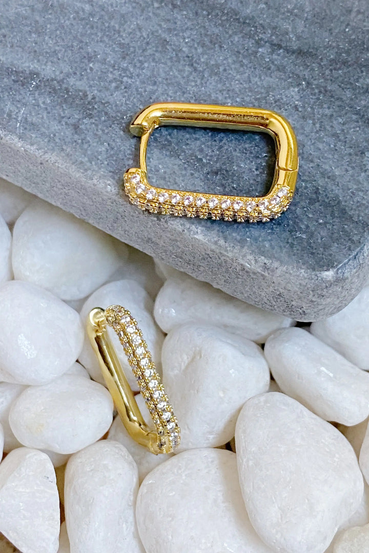 Gorgeous, sparkling hoop earrings. So chic in rectangle shape, perfect size for everyday, dressy enough with sparkly shine! Dimensions: 0.8” x 0.6” Gold plated Brass Cubic Zirconia Lead and Nickel Free...