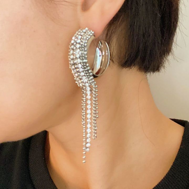Crystal Fringe Hoop Earrings – Silver Statement Dangle Hoops