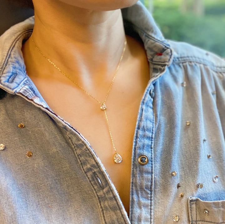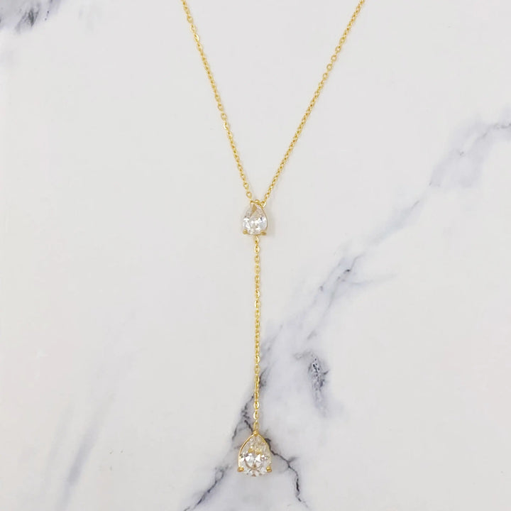 Absolutely beautiful 2 different tear drop solitaire Cubic Zirconia stones make a perfect harmony in this necklace. Gorgeous with dainty chain and shines beautifully! •Dimensions: 16 inch chain length with a...